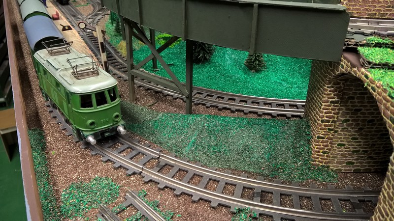 Mit Material aus den Kindertagen, ergänzt um Teile von Trödelmärkten, wurde diese 1,90 x 1,10 m große historische Modellbahnanlage erstellt, auf der mehrere Züge zugleich fahren können.
