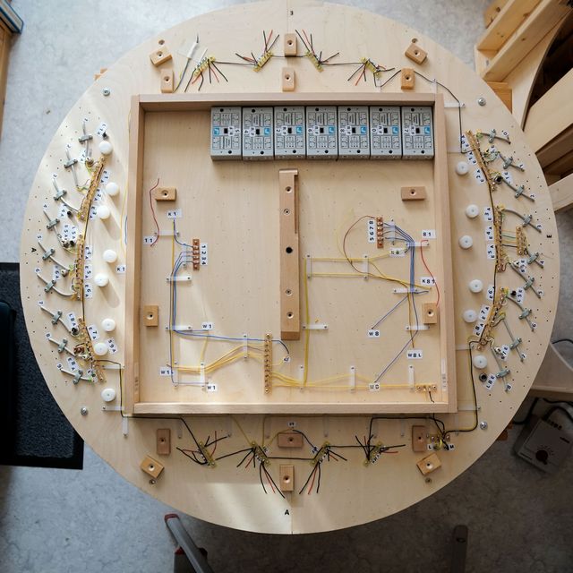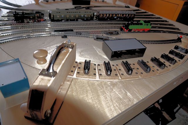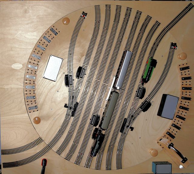 Der Zugspeicher ist als überdimensionale Drehscheibe ausgeführt. Die Anregung dazu stammt aus der Zeitschrift „eisenbahn magazin“ (11/2015, S. 52, Rein und raus mit kurzen Zügen), der dortige Gleisplan wurde weiter entwickelt. Er erlaubt jetzt die Aufnahme von 8 Zügen, Lok-Umsetzungen unter Beibehaltung der Wagenreihung, Lokwechsel und Wagenwechsel. Die maximale Zuglänge beträgt ca. 85 cm.