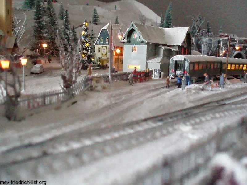 Vorn auf der Anlage, im Bahnhof, soll ein ewig stehender Zug gut beleuchtet stehen bleiben. Die Eisenbahn spielt auf dieser Anlage nur eine untergeordnete Rolle, fahren soll natürlich etwas. Mit viel Schnee auf den Dächern. Bei der „Spur der Mitte“ sieht es mit Winterfiguren schlecht aus, deshalb sind die „großen“ Wintersportler im Hintergrund auf der Piste zu sehen. Wenn nun der Personenzug der späten sechziger Jahre am Bahnhof hält, könnte man glatt selber aussteigen um hier ein paar Tage Urlaub zu verbringen. Mancher meinte beim Betrachten der Fotos, dass er früher schon einmal hier war.